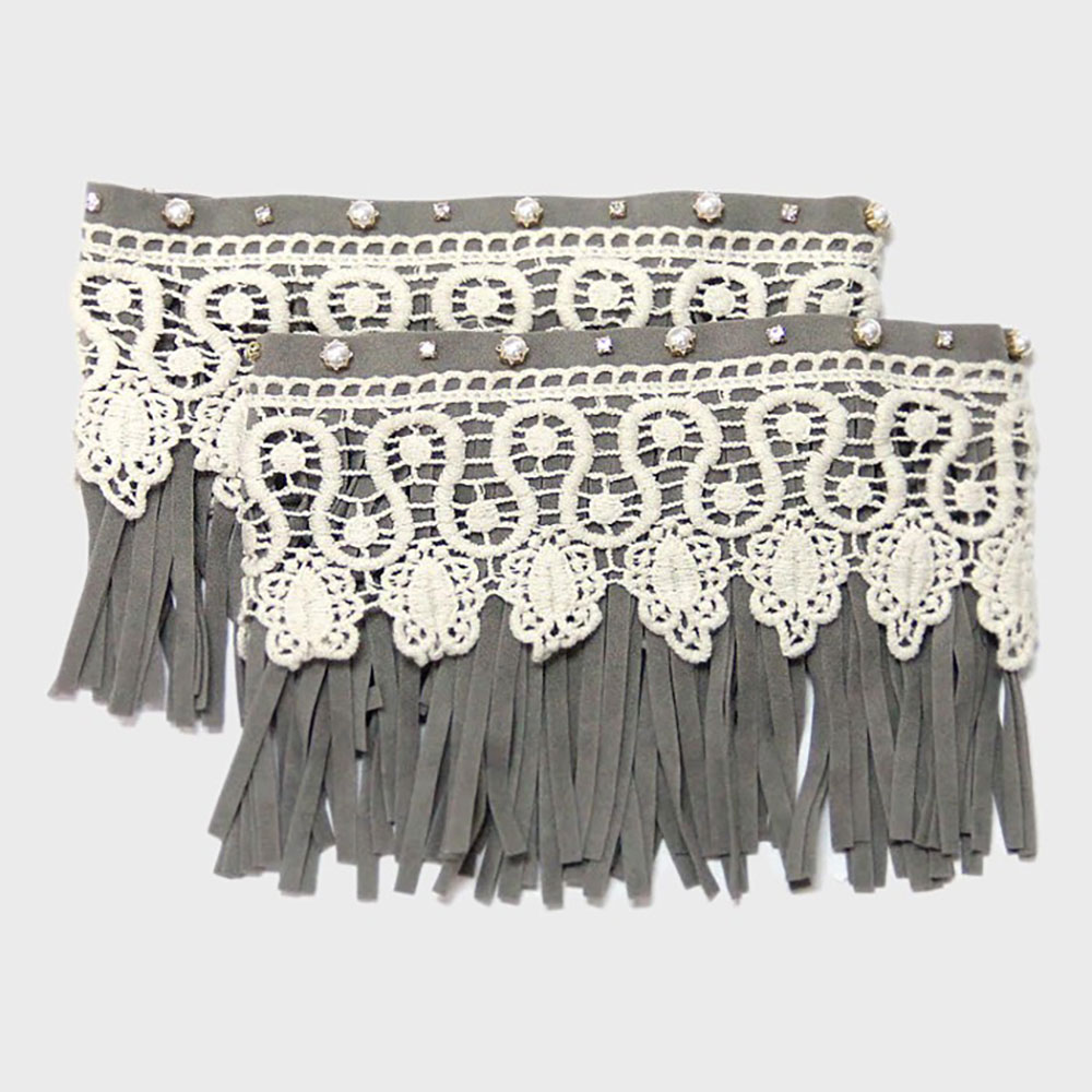 • These lace fringe boot cuff accessories bring a touch of boho-chic flair to any outfit. Featuring elegant lace detail and playful fringe, they slip easily over boots for an instant style upgrade. Perfect for adding texture and feminine charm to both casual and dressy seasonal looks.