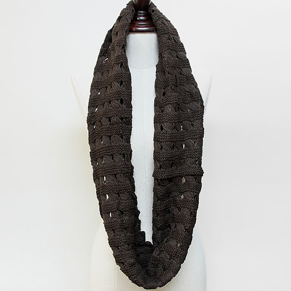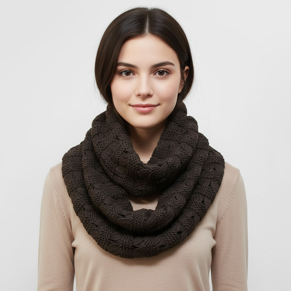 Details • Size : 13" X 42" • Material : 100% Acrylic • Add warmth and texture to your look with this chunky cable knit infinity scarf. Its soft, looped design offers effortless layering and cozy coverage, perfect for pairing with everyday outfits or elevating your cold-weather wardrobe with timeless style.