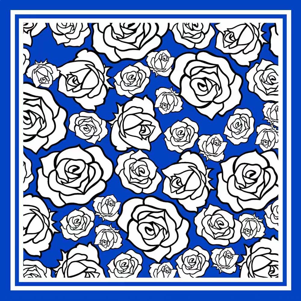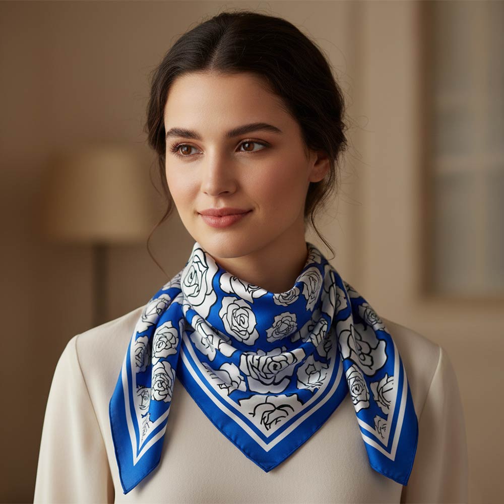 Details • Size : 23.45" X 23.45" • Material : 100% Polyester • Elegant square scarf featuring an allover rose-inspired print framed by a clean border design. Lightweight and versatile for styling around the neck, hair, bag, or wrist. Perfect for everyday wear, travel, gifting, and adding a bold yet timeless floral statement to any outfit.