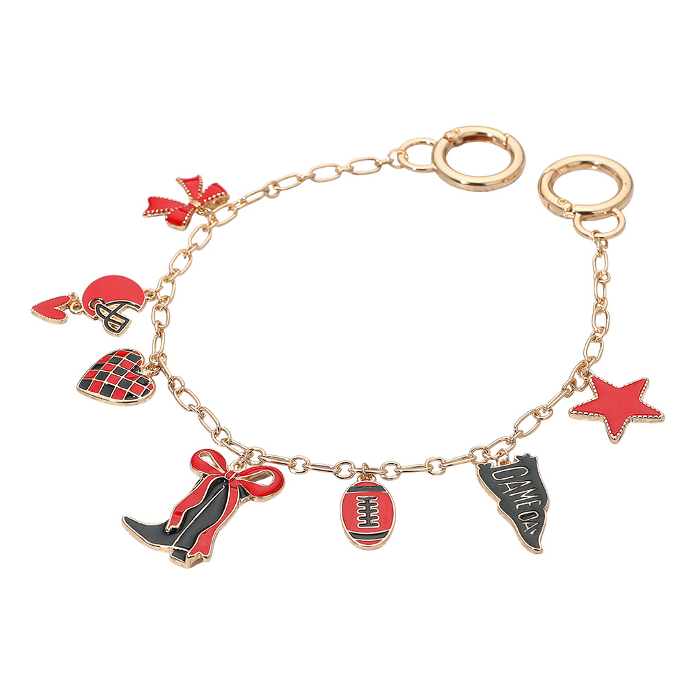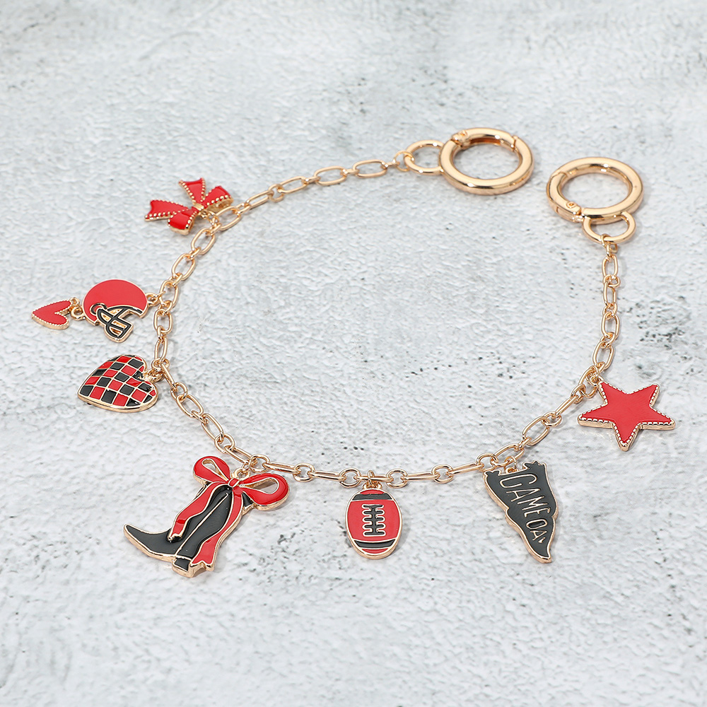 • Bag charm featuring playful gameday accents including football, helmet, boots, stars, hearts, and cheer icons. A fun accessory to show team spirit, personalize bags, and add a sporty touch to gameday outfits.