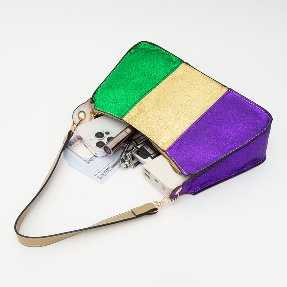 Details • Size : 10.75" X 7" X 2" • Strap 1 Size : 19" L / Detachable • Strap 2 Size : 48" L / Detachable • Stylish tri-color mardi gras shoulder bag featuring bold glitter panels and a sleek zip closure. Accented with a detachable gold-tone chain strap and comfortable shoulder handle, this sparkling design adds festive flair to evening outfits, parties, or special celebrations.