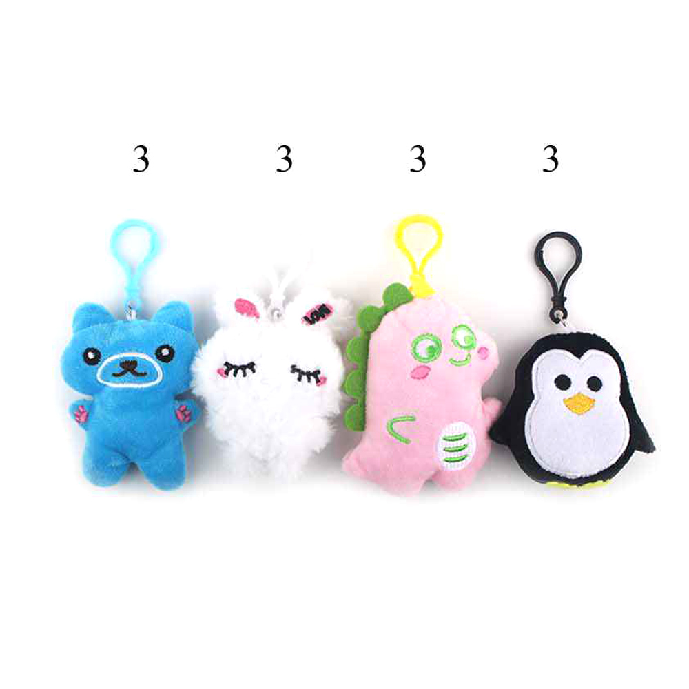 Details • Size : 5.25" - 6.5" L • Add a playful touch to your bags or keys with this 12-piece set of mini plush animal keychains. Featuring a mix of adorable characters like dinosaurs, bears, and penguins, each comes with a clip for easy attachment. Great as party favors, gifts, or collectibles.