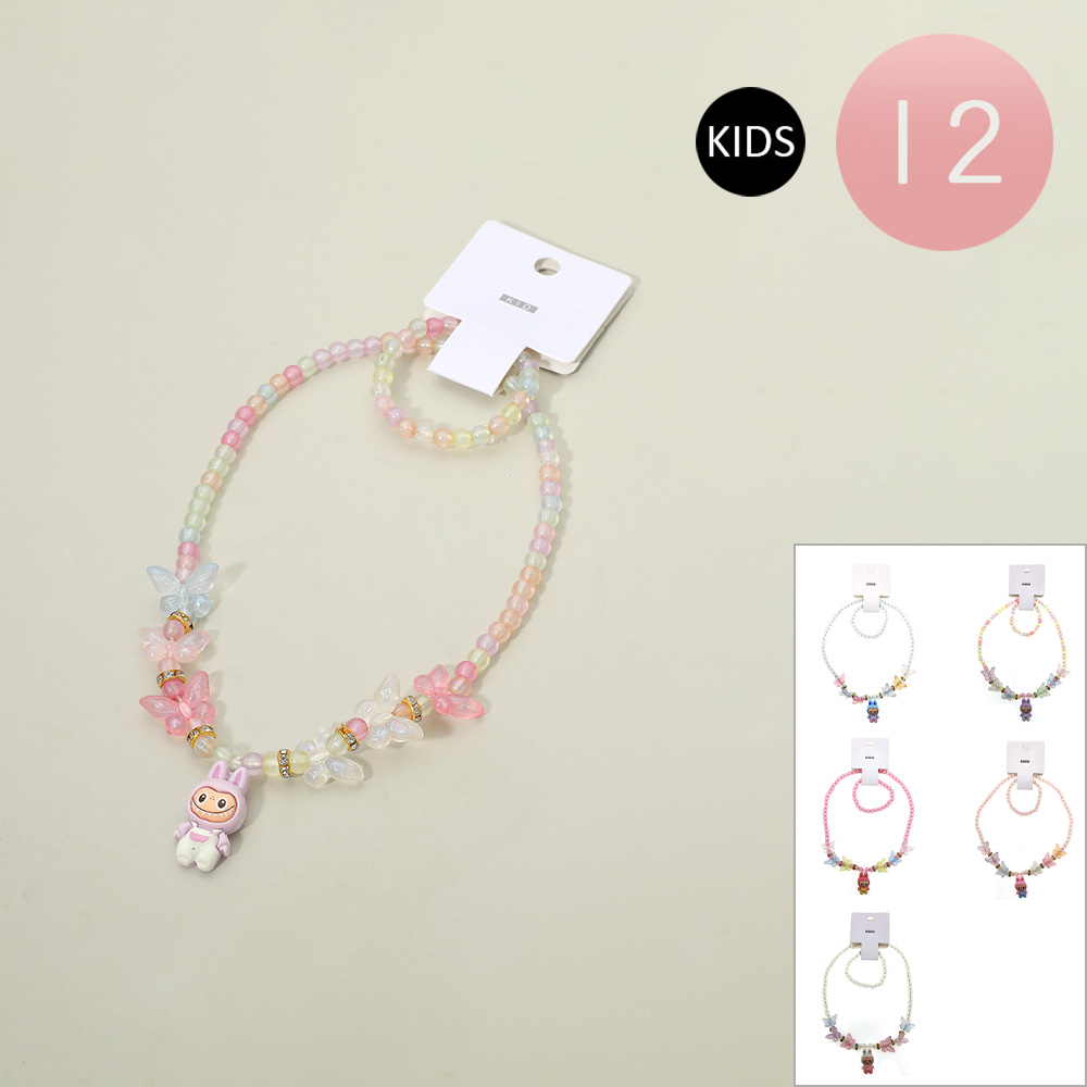 12 SET OF 2 - Kids Monster Bunny Pendant Butterfly Beaded Jewelry Set