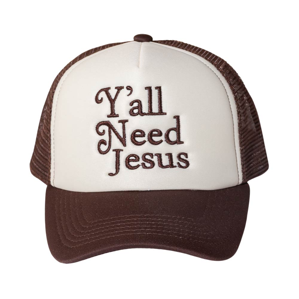 Details • Size : One Size • Bold statement trucker hat featuring “Y’all Need Jesus” embroidery for expressive everyday wear. Designed for a comfortable fit and breathable style, perfect for casual outfits, road trips, outdoor activities, or gifting with a confident message and standout personality.