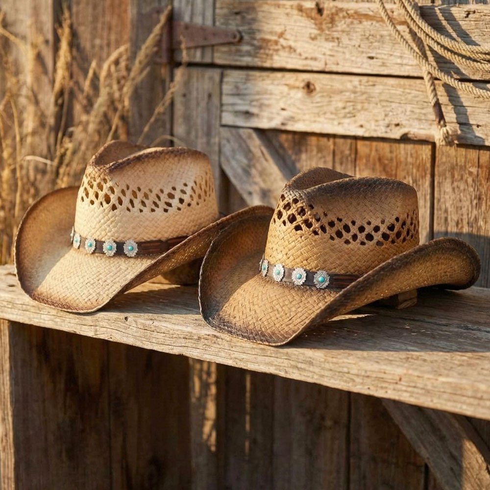 • This western cowboy hat features a ventilated crown and structured curved brim, highlighted by a decorative concho-accent band for authentic western character. Ideal for country outfits, rodeo looks, festivals, western-themed events, and boutique displays, it delivers bold style with classic cowboy appeal.