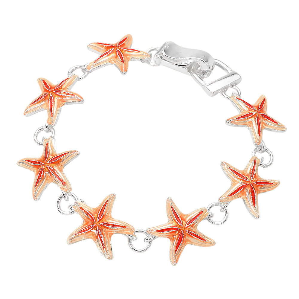 • Ocean-inspired starfish charm bracelet featuring detailed linked motifs and a secure magnetic clasp for easy wear. A playful yet stylish accessory ideal for beach boutiques, gift shops, and seasonal displays, offering standout coastal appeal and everyday versatility.