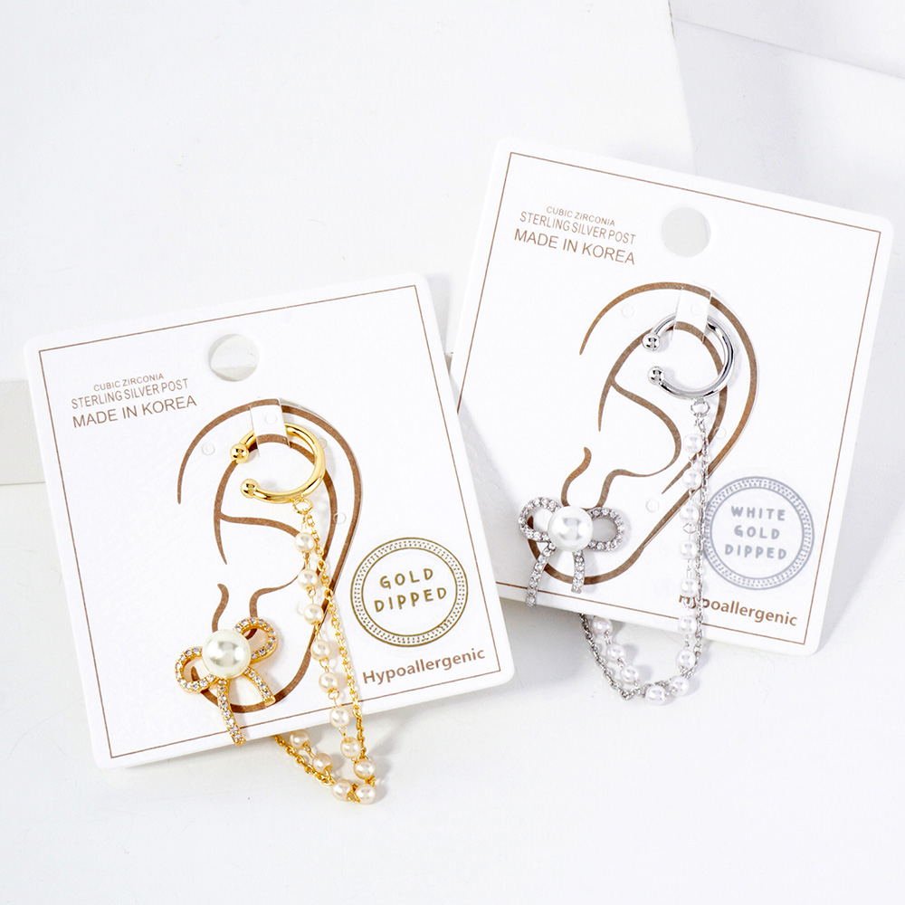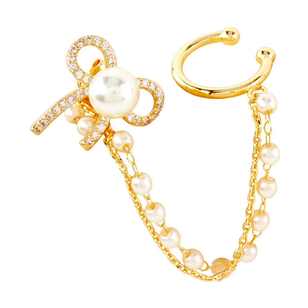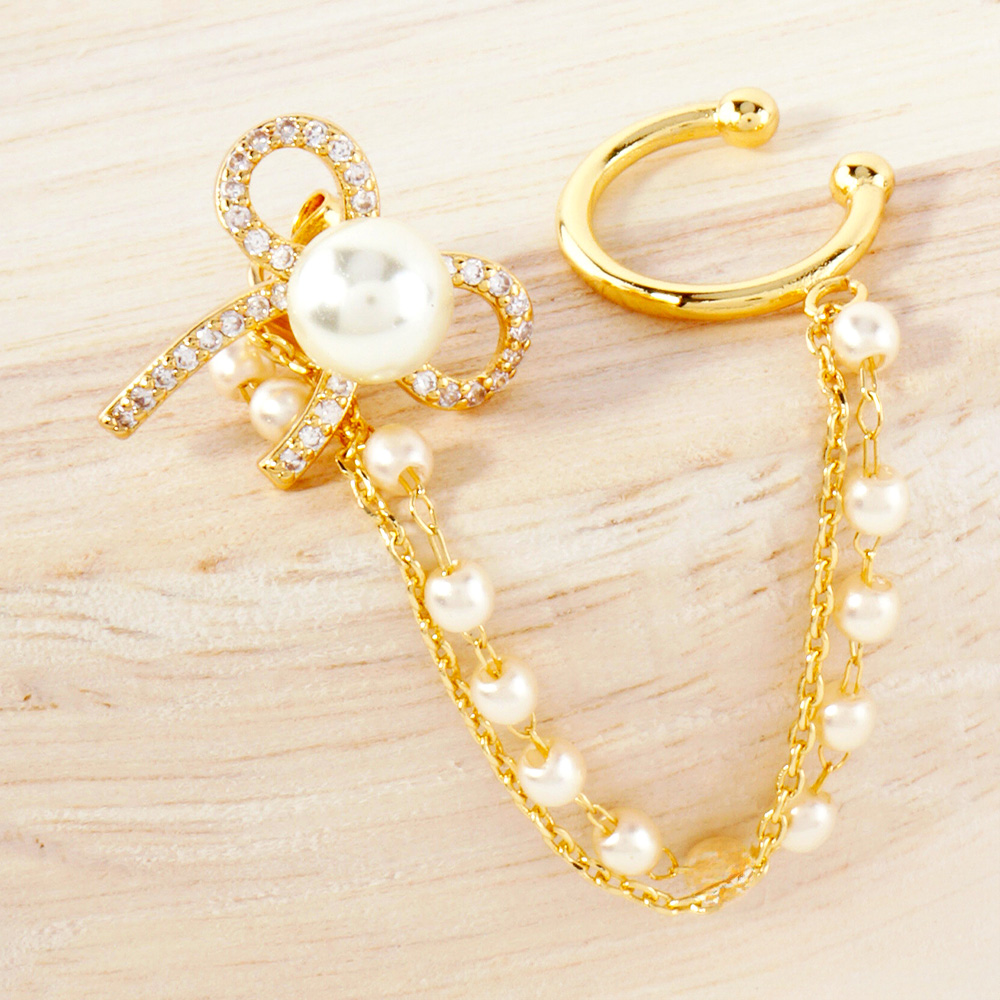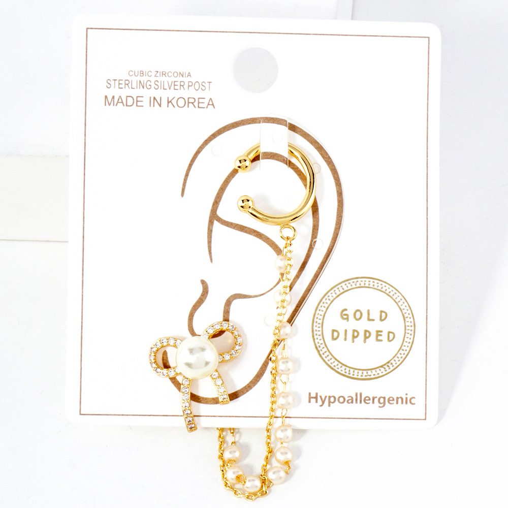 Details • Size : 1" X 2.2" • This gold-dipped chain earring features a graceful bow adorned with cubic zirconia and a lustrous pearl centerpiece, connected to an elegant ear cuff by dual pearl-accented chains. Designed with hypoallergenic sterling silver posts, it offers a refined and feminine touch for any occasion. • CZ Cubic Zirconia • Gold Dipped • Hypoallergenic • Lead and Nickel Compliant • Made In Korea • Sterling Silver Post