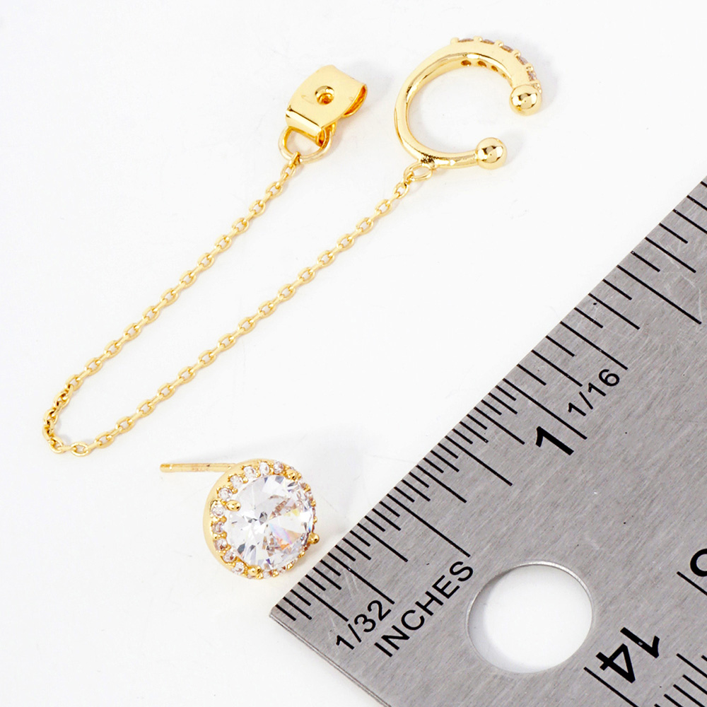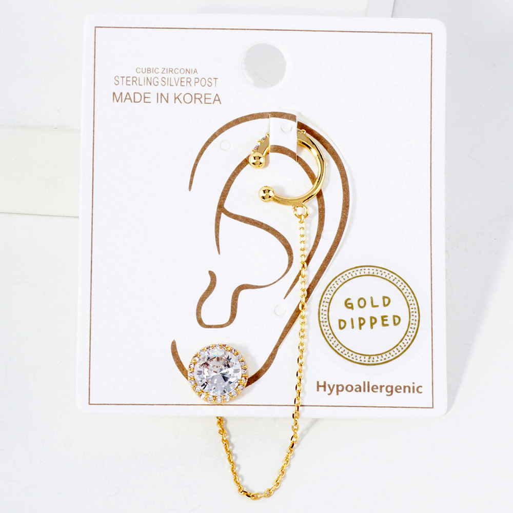 Details • Size : 0.8" X 2.2" • This refined gold-dipped chain earring pairs a dazzling round cubic zirconia stud with a sleek ear cuff, joined by a delicate chain. Designed with hypoallergenic sterling silver posts, it offers a modern yet elegant statement perfect for both casual and evening wear. • CZ Cubic Zirconia • Gold Dipped • Hypoallergenic • Lead and Nickel Compliant • Made In Korea • Sterling Silver Post
