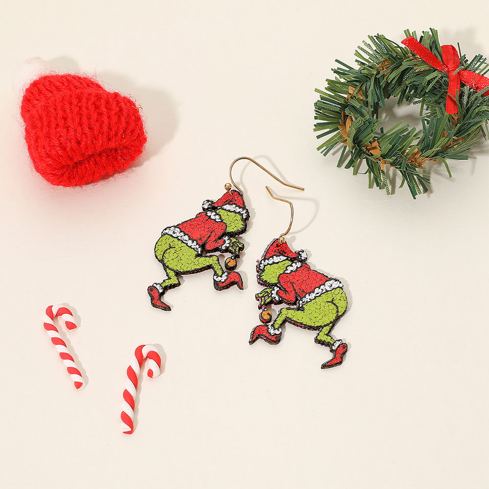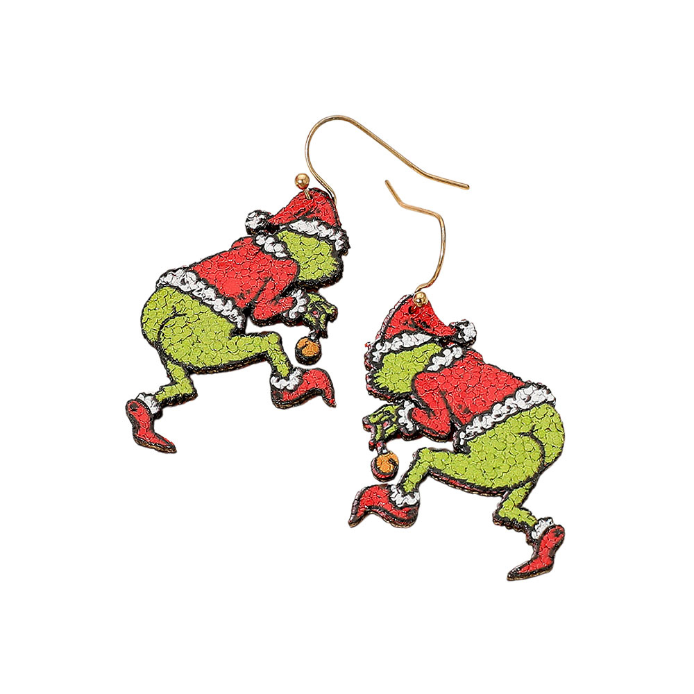 Details • Size : 1" X 2" • Fish Hook Back • Playful green monster -inspired dangle earrings that add a whimsical twist to your holiday style. Perfect for Christmas parties, festive outfits, and gifting, these lightweight statement pieces bring cheer and humor to the season’s celebrations. • Lead and Nickel Compliant