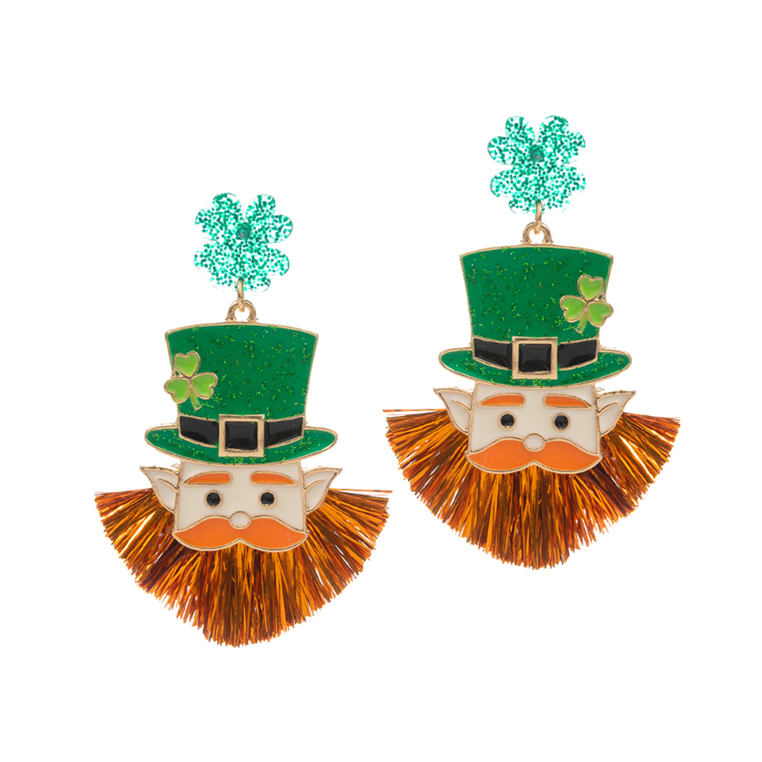 St Patricks Day Fringe Bearded Leprechaun Dangle Earrings