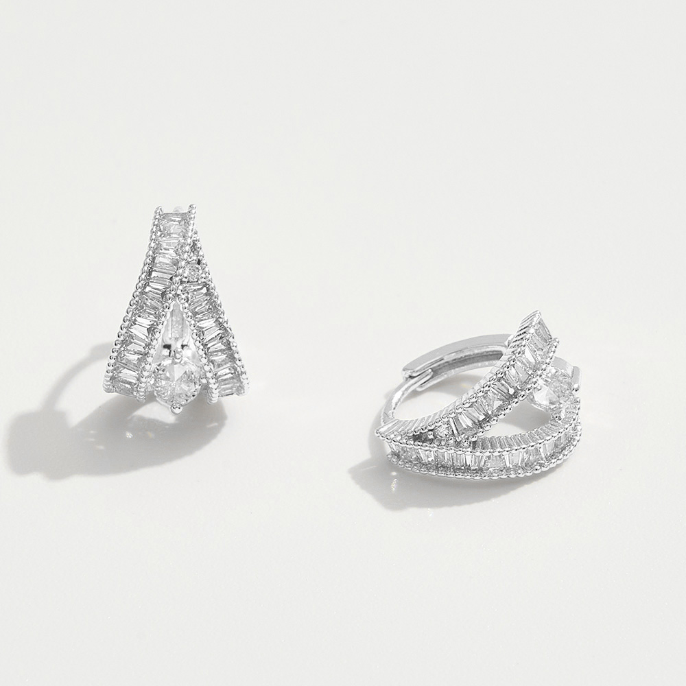 Details • Size : 0.6" X 0.6" X 0.5" • Huggie Back • These hoop earrings feature a teardrop-inspired design with dazzling baguette CZ accents that create an elegant layered effect. Their unique silhouette adds depth and sparkle, making them the perfect statement piece to elevate evening wear or special occasion outfits. • Lead and Nickel Compliant • Hypoallergenic • Made In Korea • Gold Dipped • Brass • CZ Cubic Zirconia