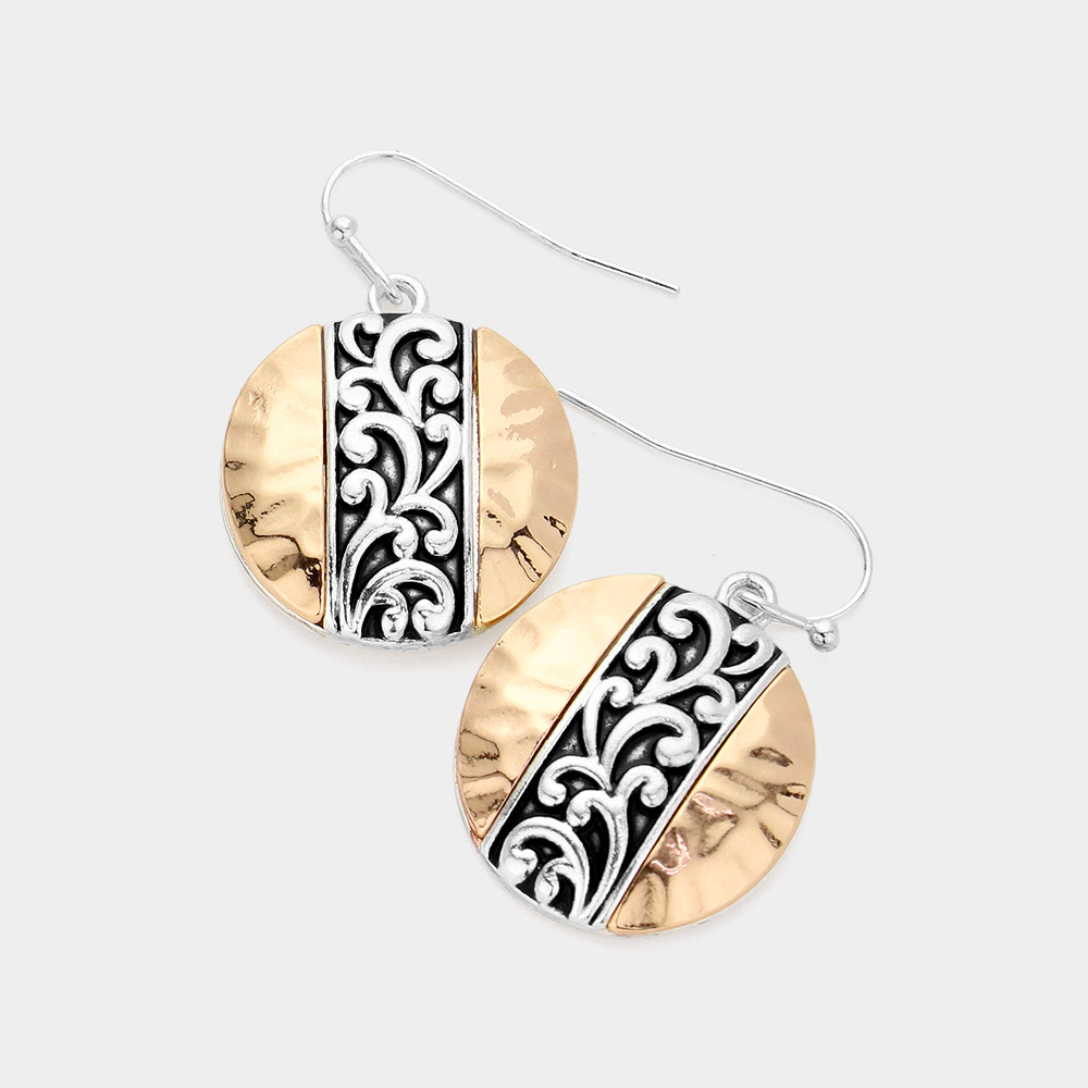 Antique Hammered Metal Filigree Disc Dangle Earrings