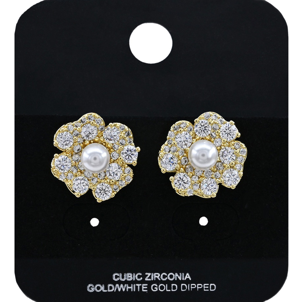 Details • Size : 0.5" X 0.5" • Post Back • Elegant flower stud earrings adorned with shimmering cubic zirconia and a luminous pearl centerpiece. Perfect for adding sophistication to everyday outfits or enhancing evening wear, these earrings make a timeless accessory or thoughtful gift. • CZ Cubic Zirconia • Gold Dipped • Lead and Nickel Compliant