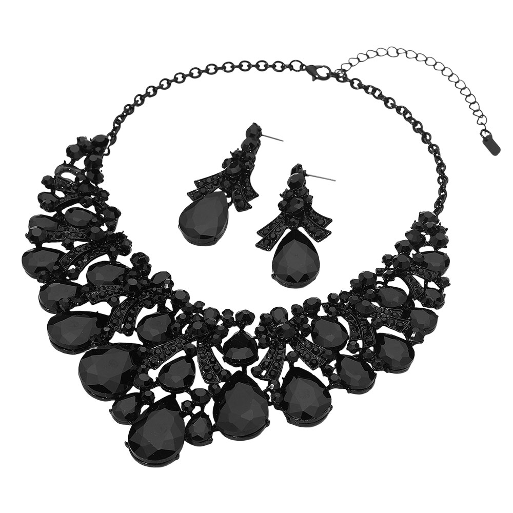 • Make an unforgettable impression with this statement teardrop bib necklace and earring set. Adorned with an array of dazzling stones and intricate detailing, this bold jewelry set adds luxurious sparkle and sophistication—perfect for weddings, galas, and evening events.
