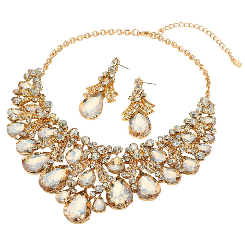 Details • Necklace Size : 18" + 3" L • Decor Size : 2.75" L • Earrings Size : 2.5" L • Make an unforgettable impression with this statement teardrop bib necklace and earring set. Adorned with an array of dazzling stones and intricate detailing, this bold jewelry set adds luxurious sparkle and sophistication—perfect for weddings, galas, and evening events. • Lead and Nickel Compliant