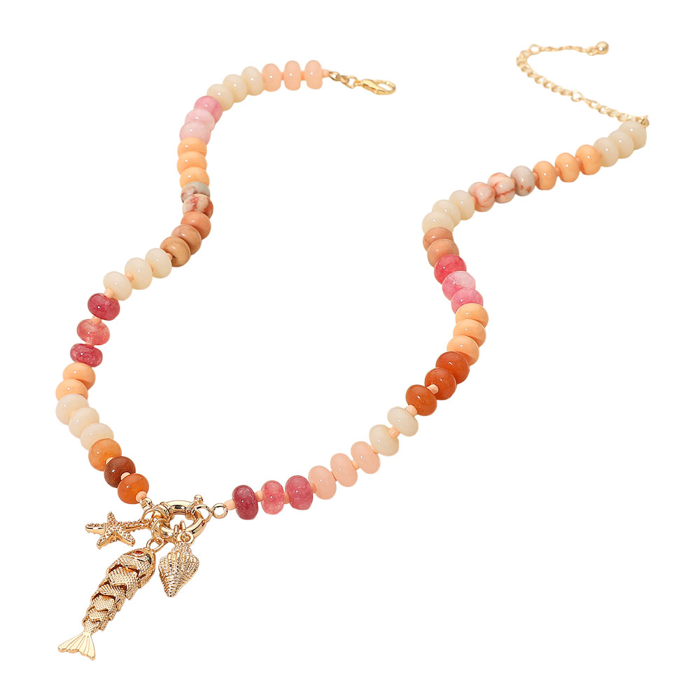 Details • Necklace Size : 17.5" + 3" L • Decor Size : 2" L • Add a playful coastal touch to your style with this colorful beaded necklace, adorned with whimsical ocean-inspired charms including a fish, starfish, and seashell. Lightweight and eye-catching, it’s the perfect accessory for layering or making a chic standalone statement. • Lead and Nickel Compliant