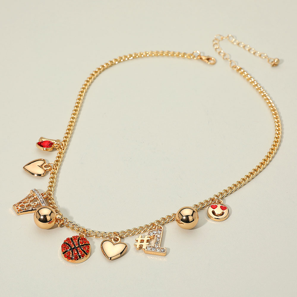 Details • Necklace Size : 16" + 3" L • Decor Size : 1" L • Celebrate your sporty side with this basketball charm necklace featuring playful pendants like a hoop, heart, emoji, and “#1” emblem. Designed for style lovers with team spirit, it adds a fun, energetic accent to any outfit and makes a perfect gift for sports fans or trendsetters. • Lead and Nickel Compliant