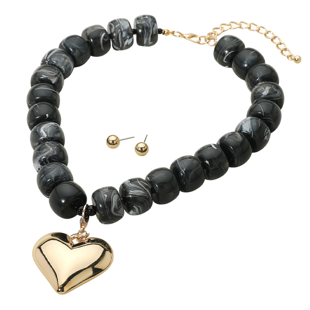 Details • Necklace Size : 17" + 4" L • Deor Size : 2.75" L • Earrings Size : 0.25" L • Make a bold statement with this chunky beaded necklace featuring large round beads and a shiny heart pendant, perfectly paired with simple stud earrings. This eye-catching jewelry set brings playful charm and modern flair, making it a standout addition to both casual and dressy outfits. • Lead and Nickel Compliant