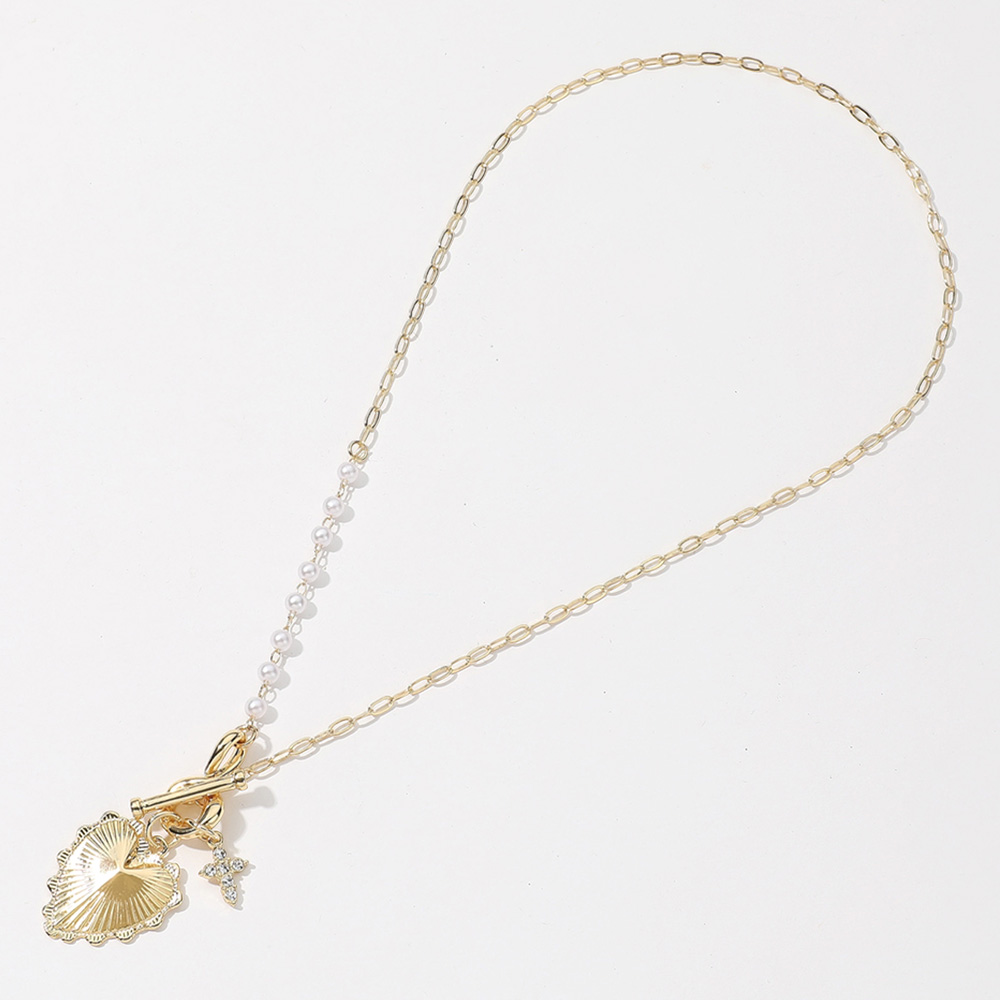 SECRET BOX_14K Gold Dipped Heart Stone Paved Cross Charm Half Pearl Chain Toggle Necklace