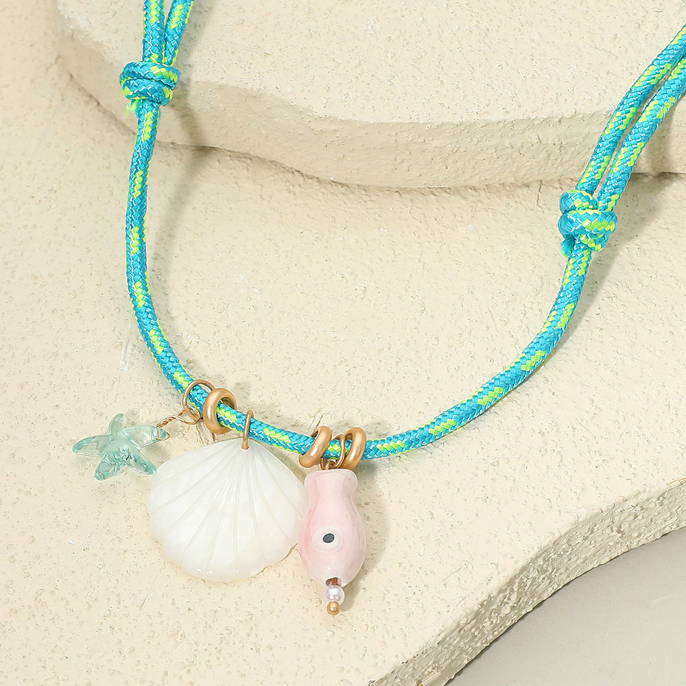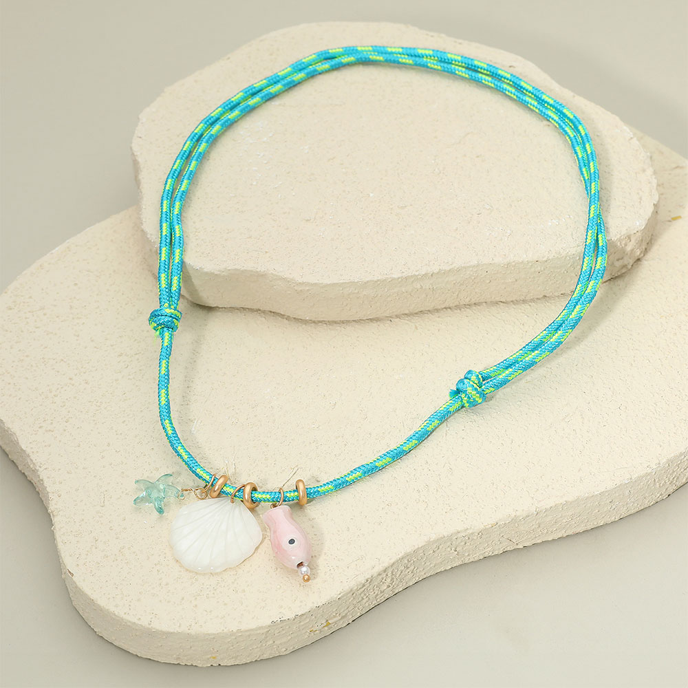 Details • Necklace Size : 30" L • Pendant Size : 1" X 1" • Adjustable • This seaside charm necklace features a vibrant turquoise adjustable cord accented with a starfish, shell, and fish pendant. Playful and breezy, it embodies a relaxed coastal vibe—perfect for beach days, summer outings, or adding a splash of ocean-inspired whimsy to everyday looks. • Lead and Nickel Compliant