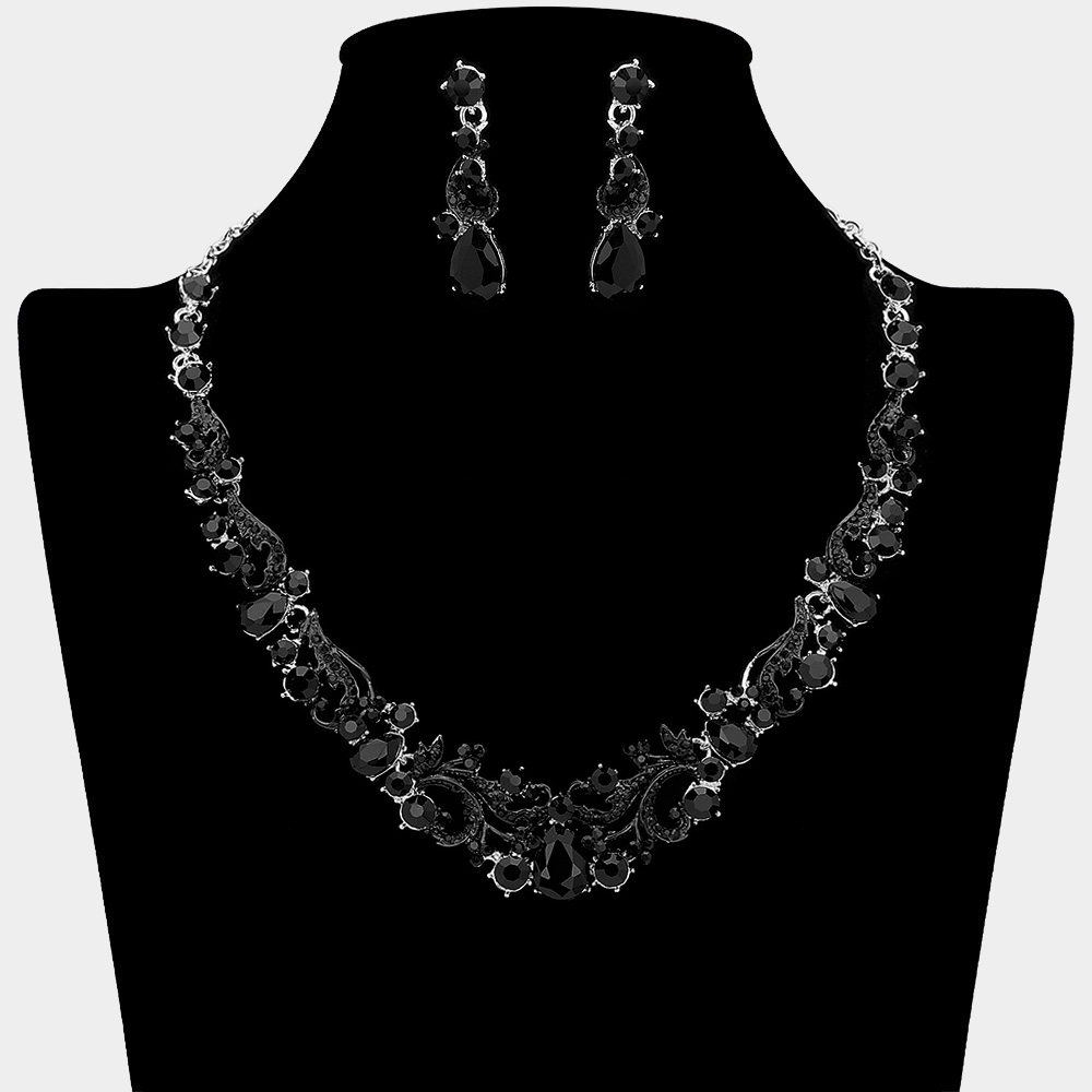 • Stunning jewelry set featuring an ornate crystal necklace with teardrop accents and matching earrings. Perfect for weddings, proms, or formal occasions, adding sophistication and timeless sparkle to any outfit.