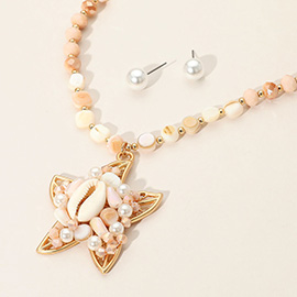 Metal Starfish Ceramic Shell Pearl Charm Drop Earrings