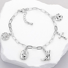 SECRET BOX_Western Steerhead Cow Heart Cowboy Boot Cherry Charm Station Pearl Link Bracelet
