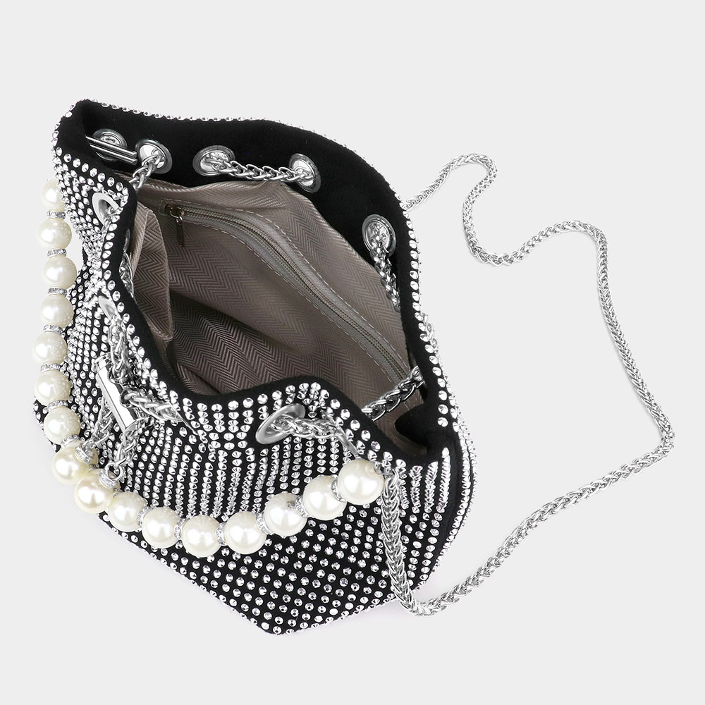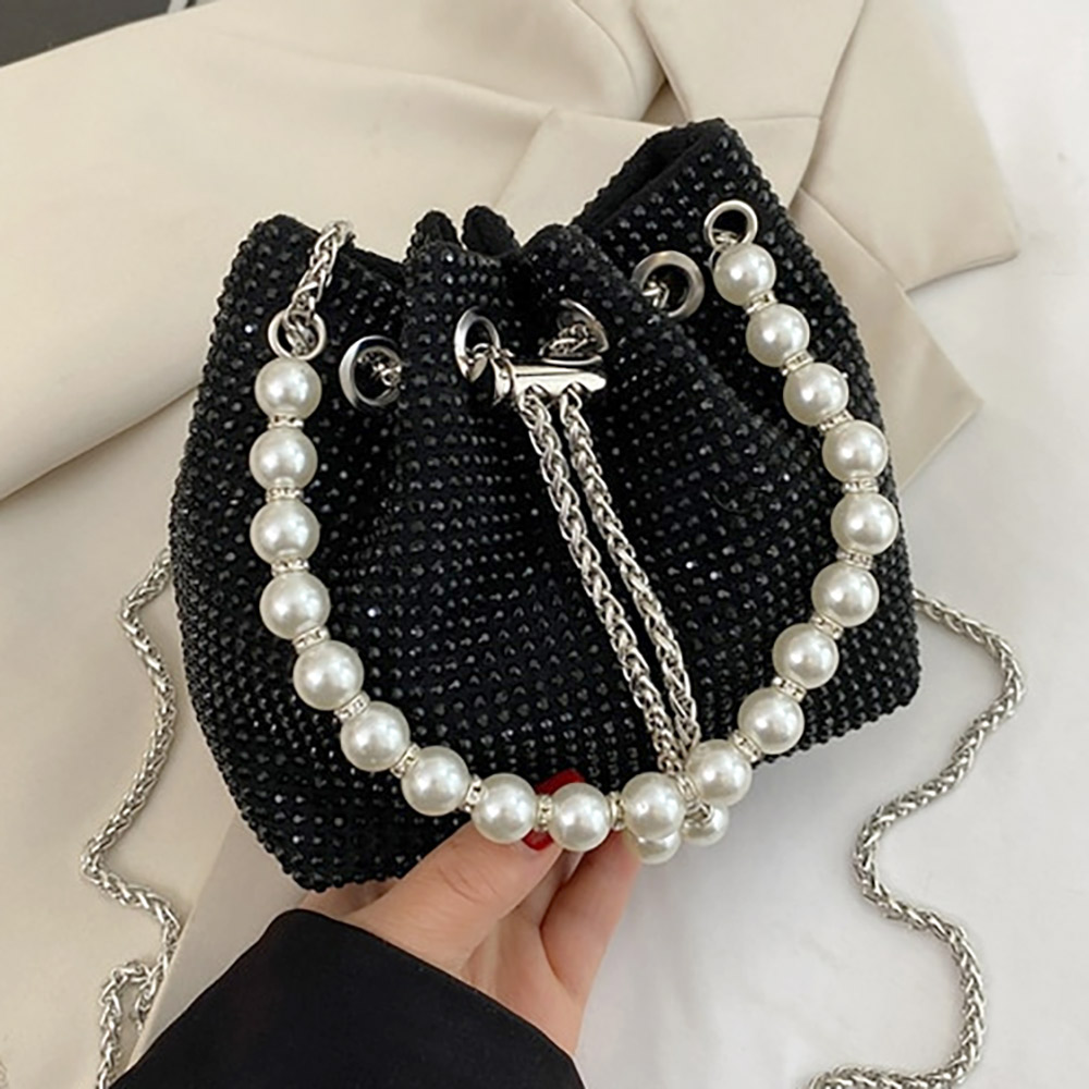 Pearl Handle Accented Bling Drawstring Chain Bucket Bag