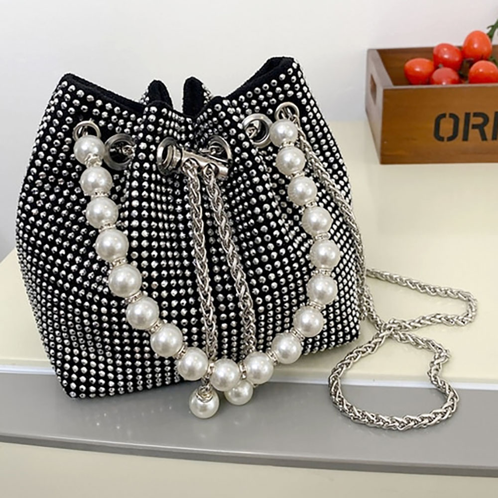Pearl Handle Accented Bling Drawstring Chain Bucket Bag