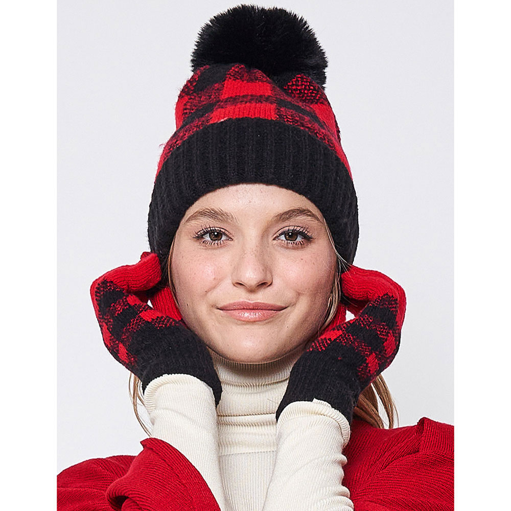 Buffalo Check Patterned Faux Fur Pom Pom Beanie Hat