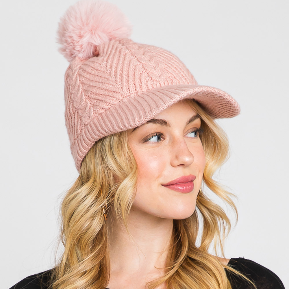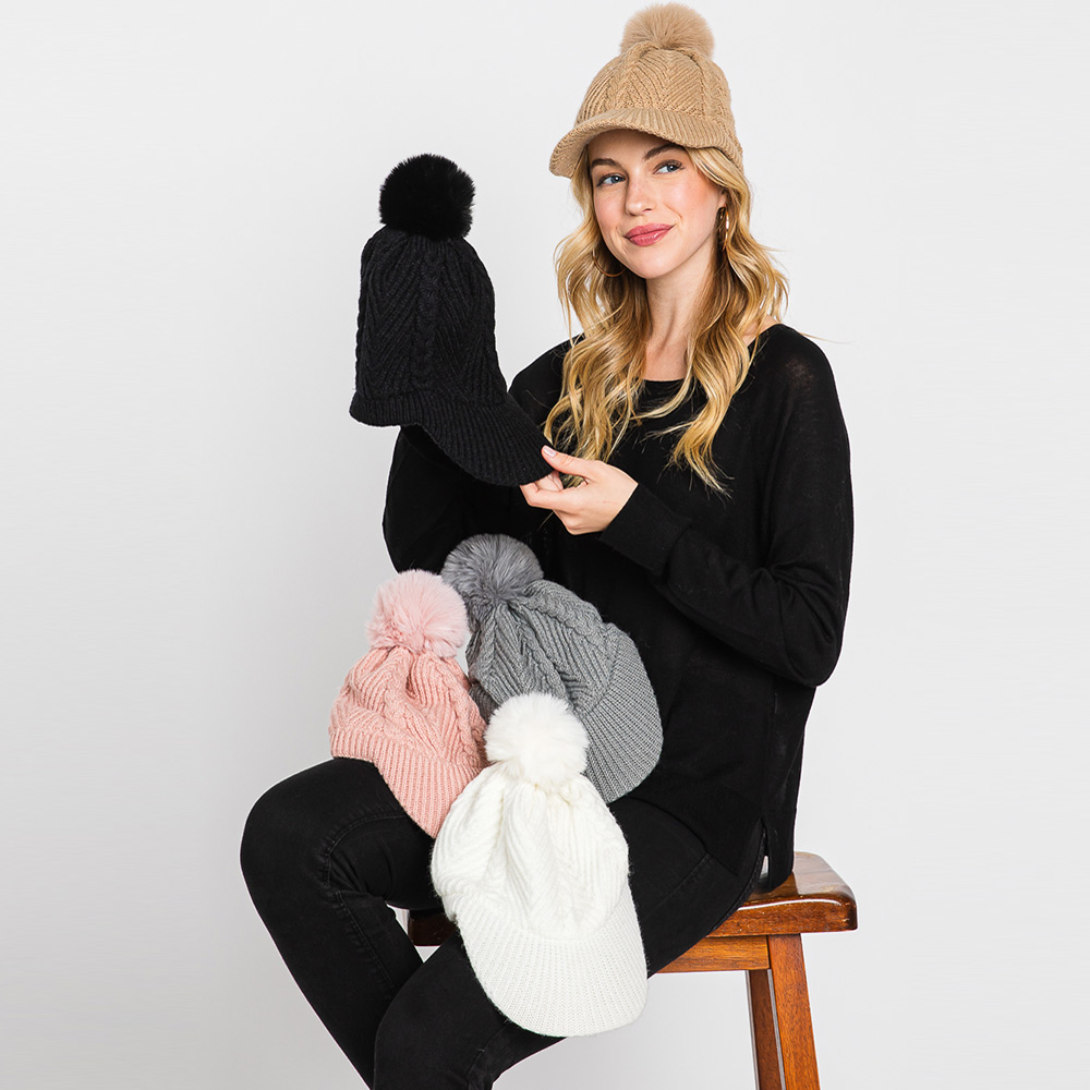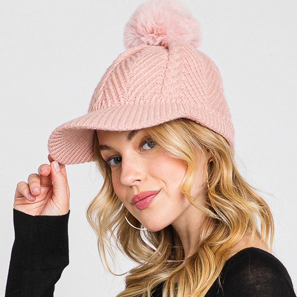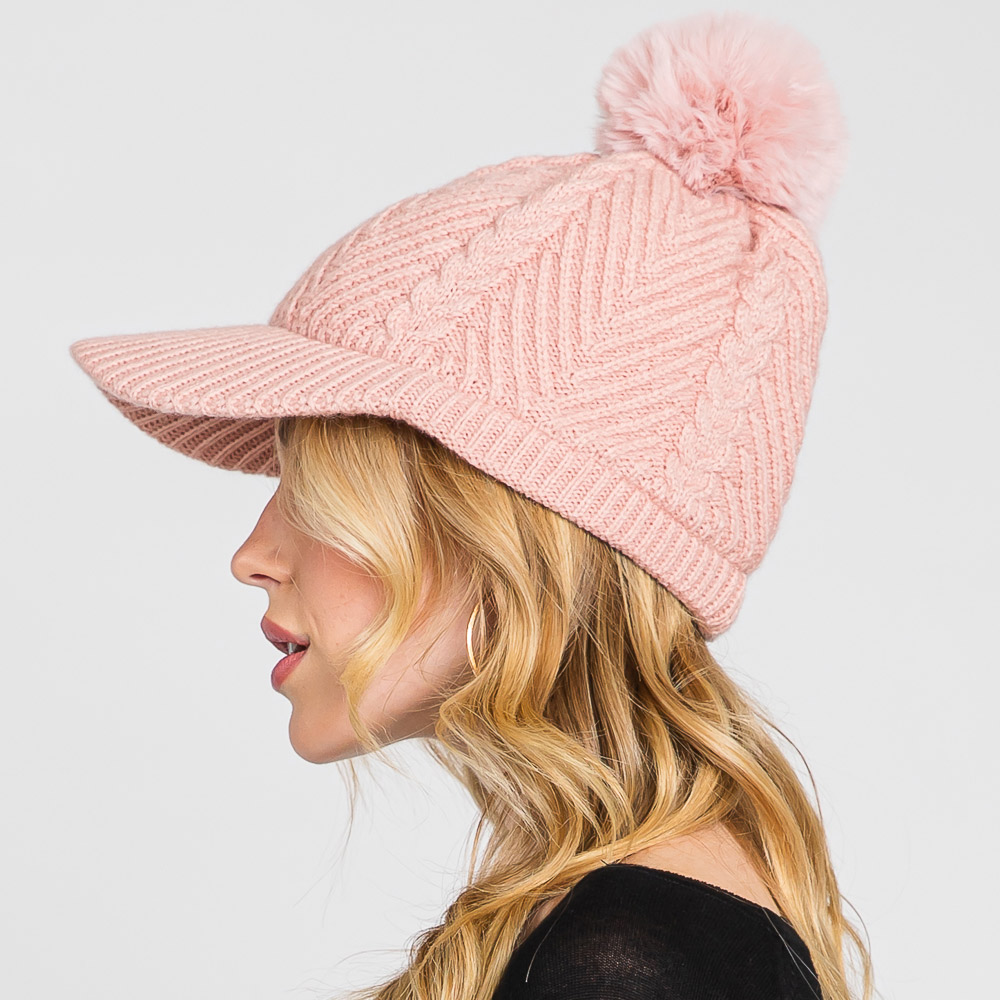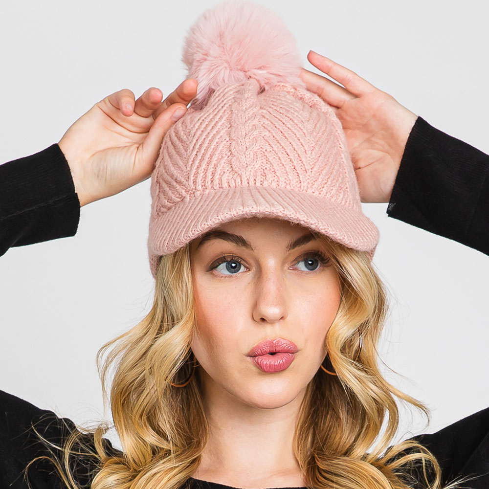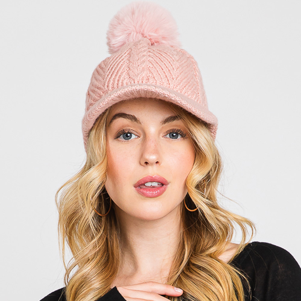 Chevron Patterned Faux Fur Pom Pom Knit Cap