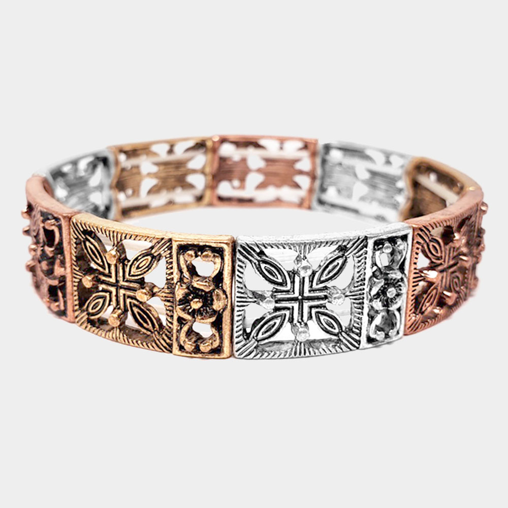 Embossed Cross Metal Bar Faux Leather Tassel Charm Stretch Bracelet
