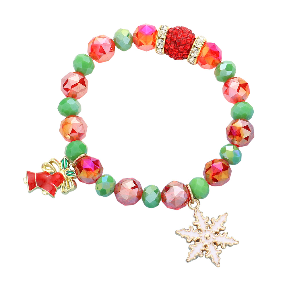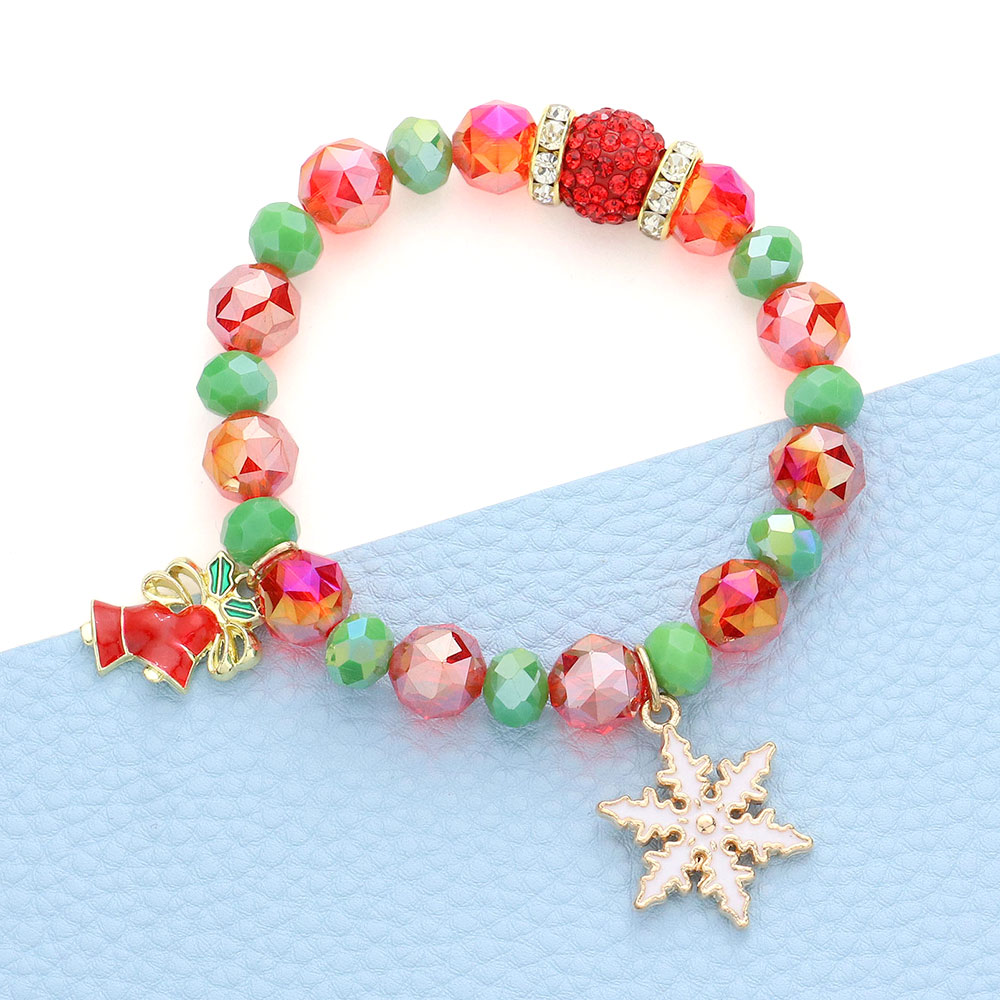 Christmas Jingle Bell Snowflake Charm Faceted Beaded Stretch Bracelet
