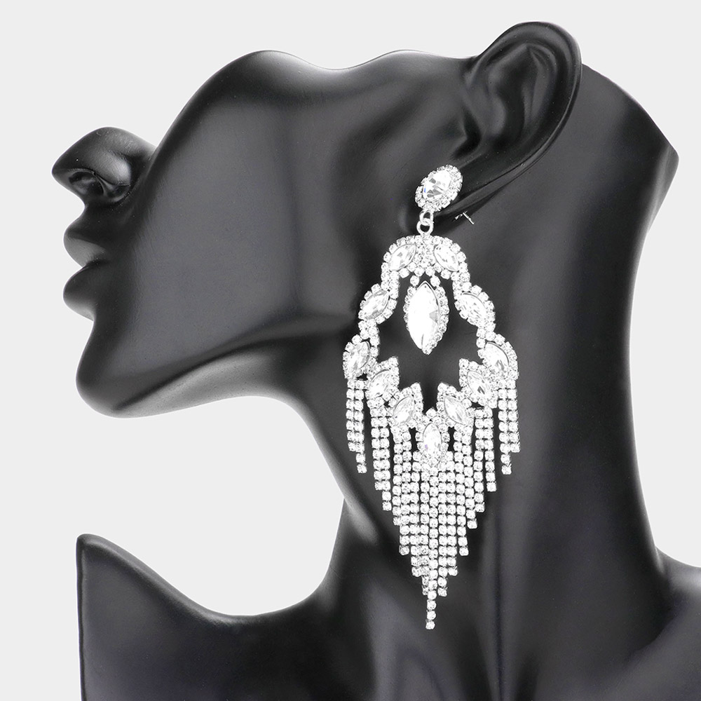 Marquise Stone Accented Rhinestone Fringe Dangle Evening Earrings