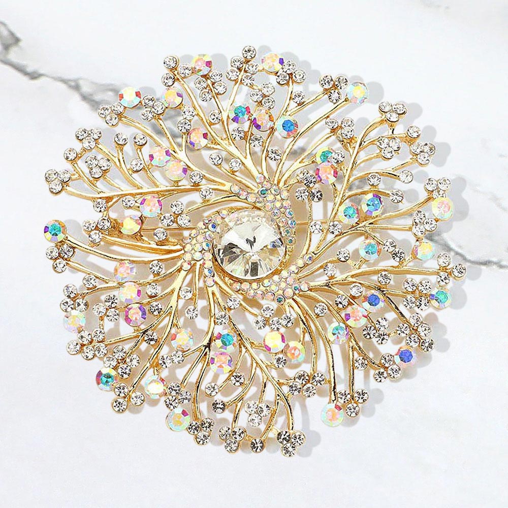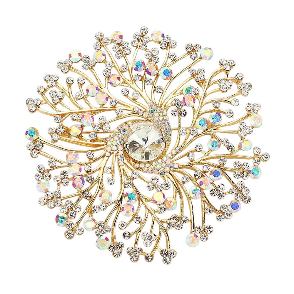 Details • Size : 3.6" X 3.6" • Pin Brooch • A dazzling brooch featuring an intricate burst design that captures light beautifully for an elegant, eye-catching finish. Perfect for adding a refined touch to formal wear, accessories, or special-occasion outfits with its sparkling, detailed craftsmanship. • Lead and Nickel Compliant