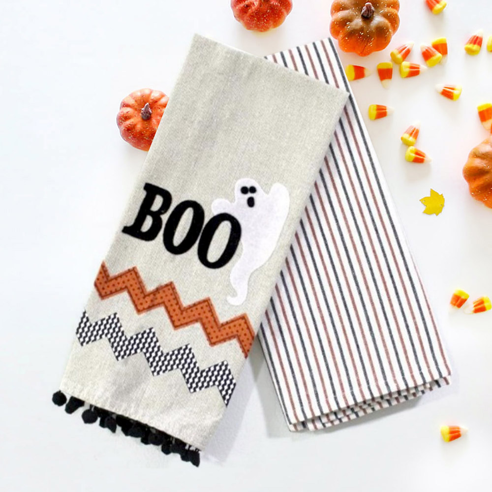 2PCS - Boo Message Ghost Zigzag Chevron Patterned Tiny Pom Pom Trimmed Kitchen Towels