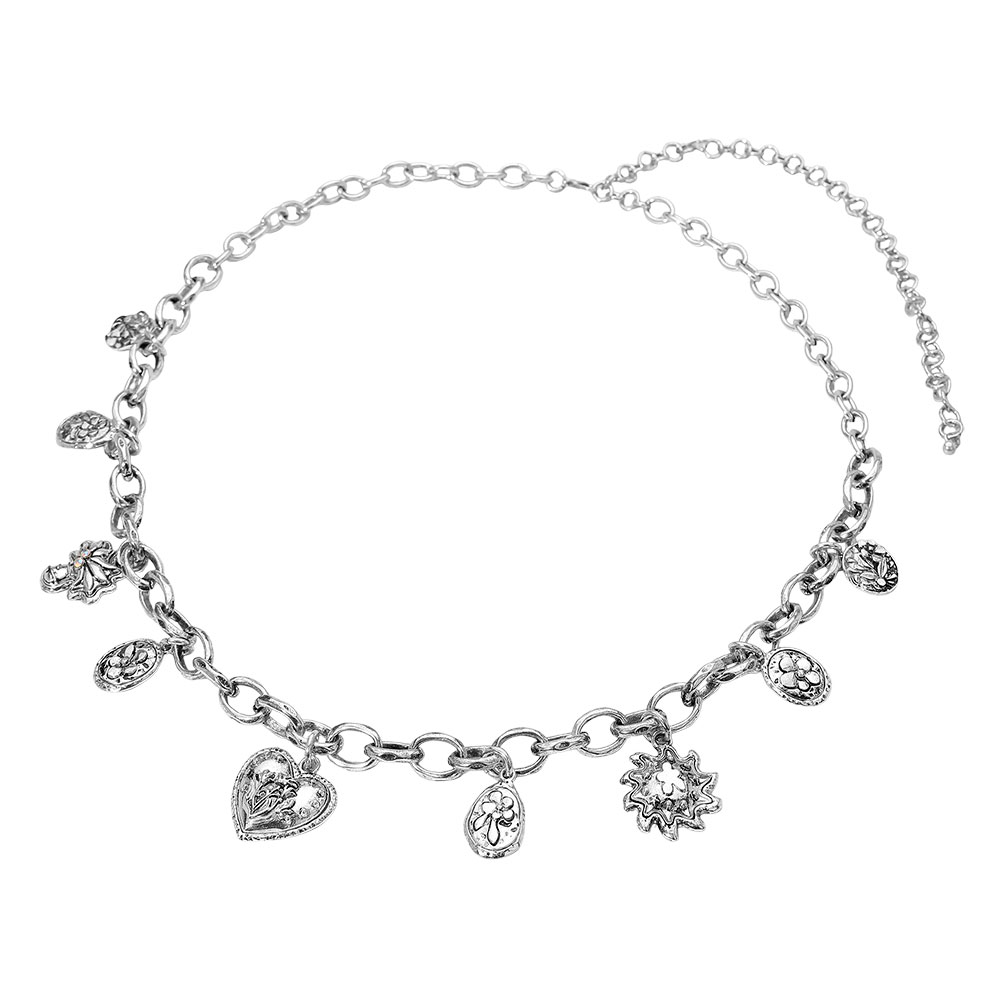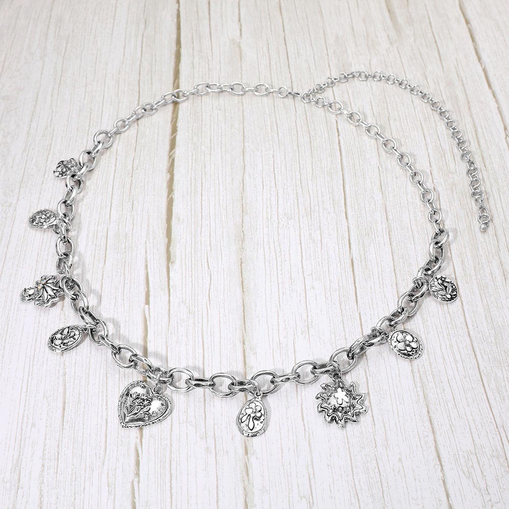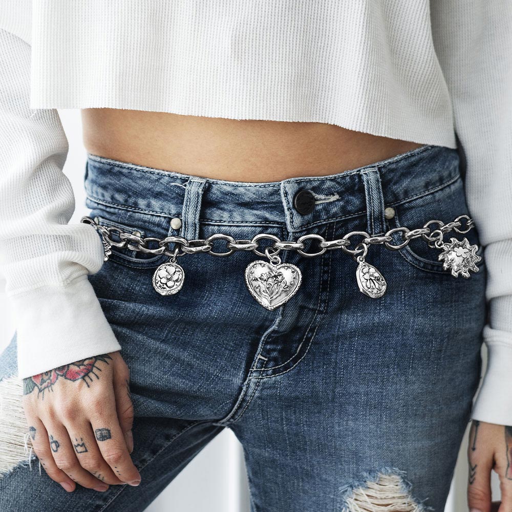 Details • Size : 2" H, 33" + 11" L • This Western-inspired chain waist belt features detailed charm pendants that bring a bold and stylish touch to any outfit. Its adjustable link design ensures a comfortable fit, making it perfect for pairing with jeans, skirts, or dresses to create a chic, statement-making look. • Lead and Nickel Compliant