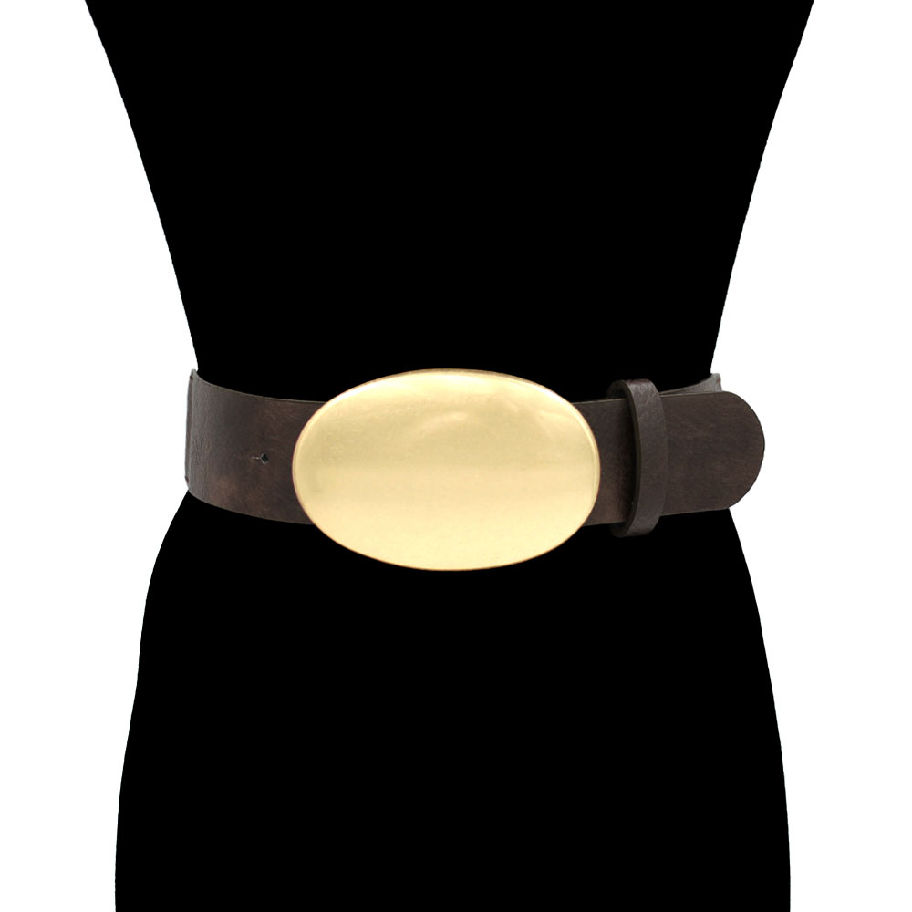 • This oval buckle statement belt combines bold design with refined elegance. Featuring a sleek wide band and a smooth, polished buckle, it adds a sophisticated accent to any outfit. Perfect for cinching the waist or enhancing casual and dressy looks with timeless appeal.
