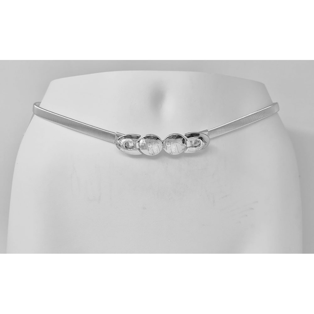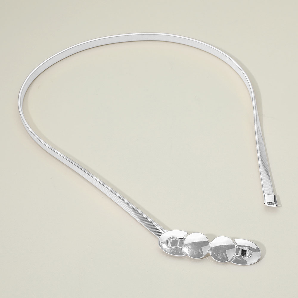 Details • Size : 0.8" H, 28" L • Stretchable • Hook Closure • Refine your silhouette with this elegant waist belt featuring a sleek strap and polished oval accents. Designed to enhance dresses and formalwear, this chic accessory adds a modern touch of sophistication, making it perfect for weddings, evening events, or elevating everyday looks. • Lead and Nickel Compliant