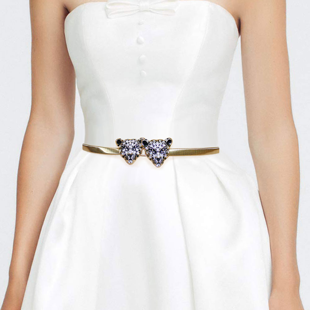 Details • Size : 1.4" H, appx 28" L • Stretchable • Hook Closure • Add a bold touch to your look with this slim waist belt featuring twin crystal panther heads. Perfect for dresses and special occasions, it blends elegance and edge while enhancing your silhouette. A chic accessory designed to elevate both formal and casual outfits effortlessly. • Lead and Nickel Compliant