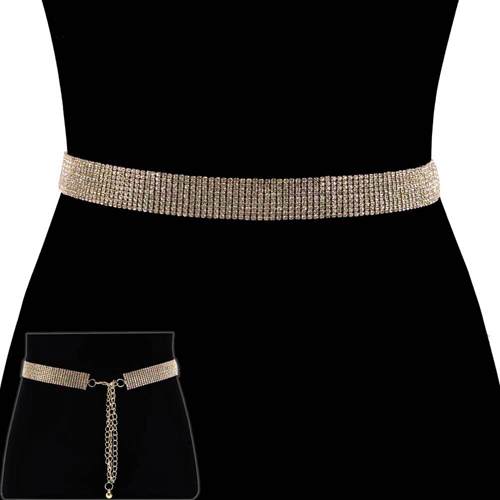Details • Size : 1" H, 27" + 20" L • This slim waist chain belt features rows of shimmering rhinestones with an adjustable chain back for a sleek, contoured fit. Designed to define the waist with subtle sparkle, it pairs effortlessly with dresses, jumpsuits, and evening looks, making it a versatile statement accessory for special occasions and elevated everyday styling.
