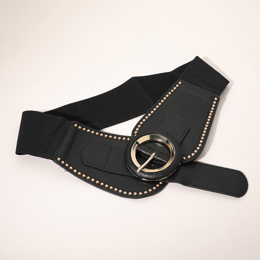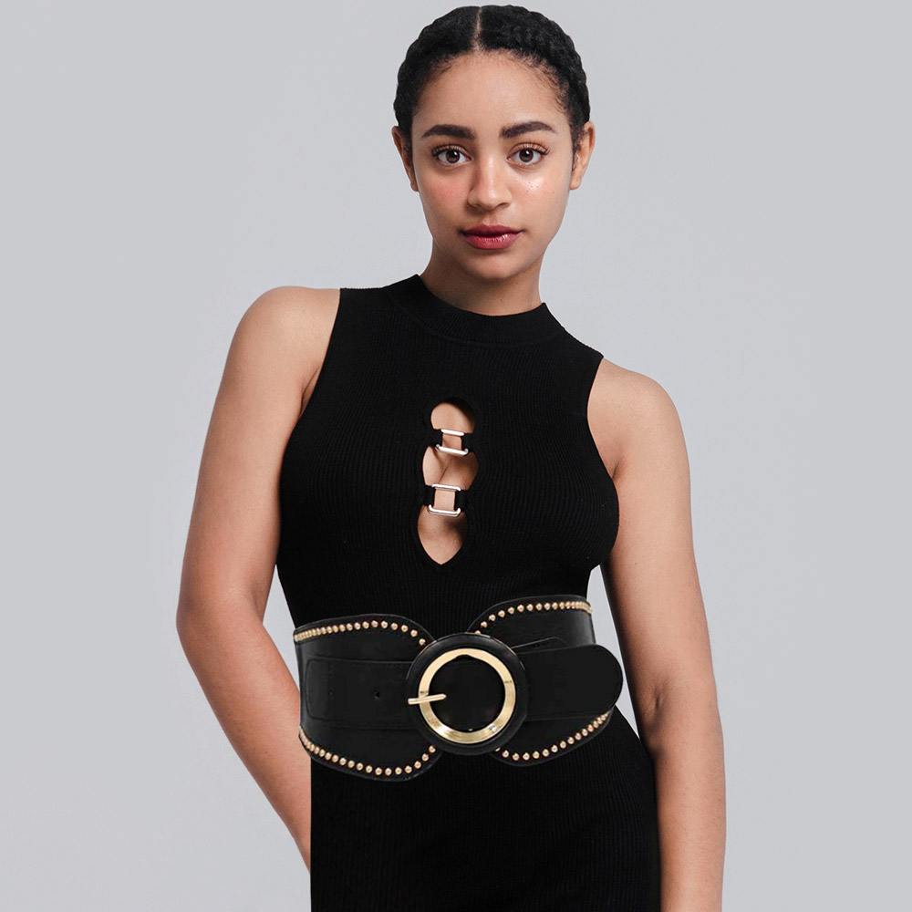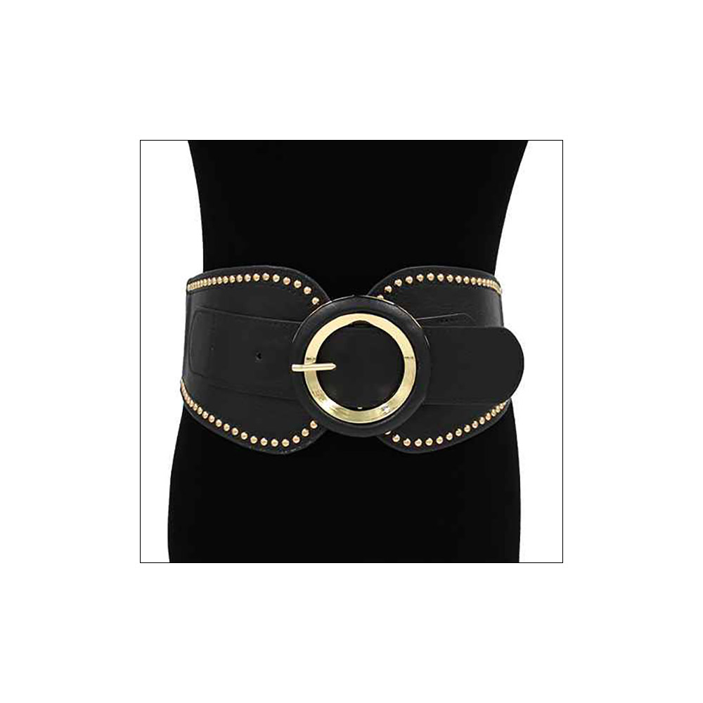 Details • Size : 4.3" H, 39" L • Stretchable • This wide circle buckle waist belt makes a bold fashion statement with its structured design and studded detailing. The sleek circular buckle adds modern flair, making it ideal for cinching dresses, coats, or tops. Perfect for creating a flattering and confident silhouette. • Lead and Nickel Compliant