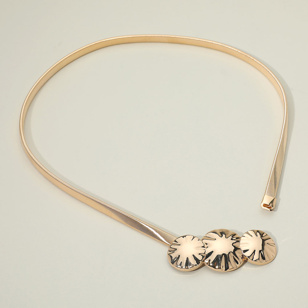 Triple Textured Round Buckle Accent Slim Metal Stretch Belt