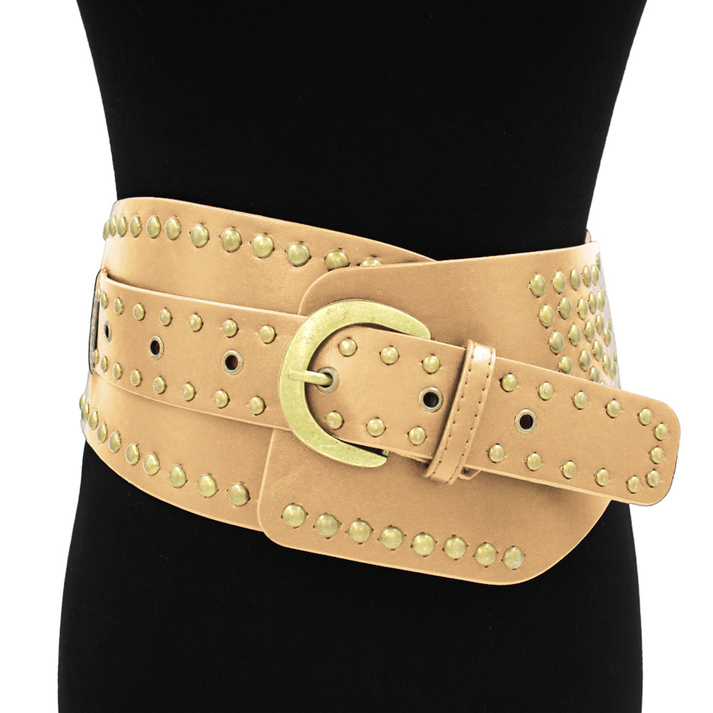 • Define your silhouette with this studded wide waist belt designed to enhance outfits with bold structure and modern style. Featuring an adjustable fit and statement detailing, it layers effortlessly over dresses or separates to elevate everyday looks.