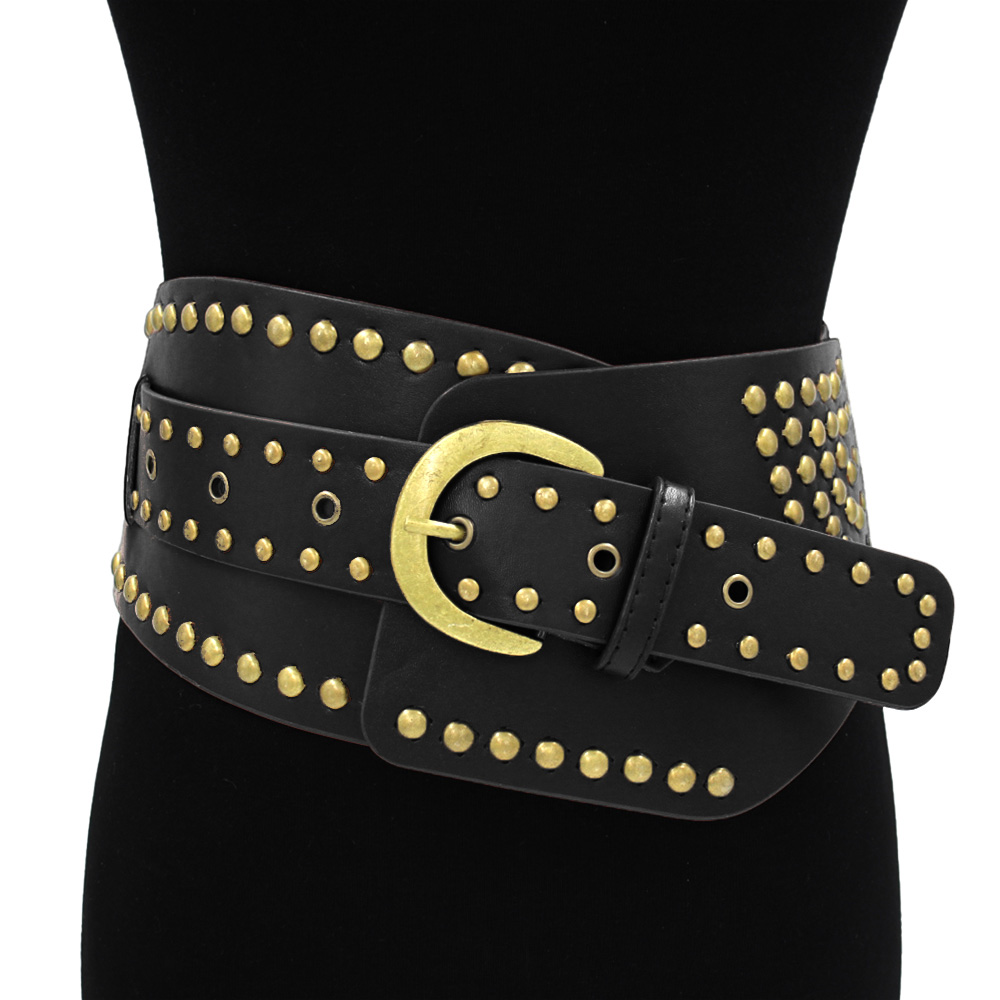 • Define your silhouette with this studded wide waist belt designed to enhance outfits with bold structure and modern style. Featuring an adjustable fit and statement detailing, it layers effortlessly over dresses or separates to elevate everyday looks.