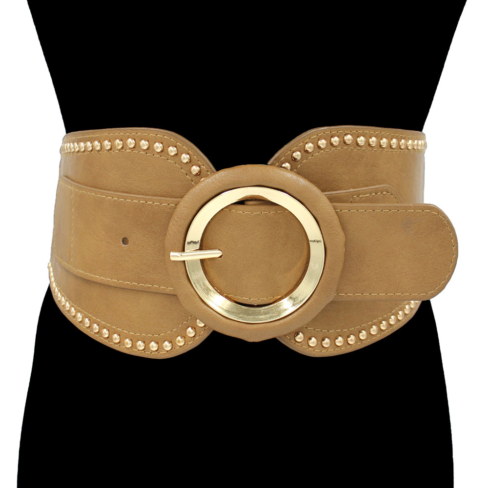 Details • Size : 4.3" H, 39" L • Stretchable • This wide circle buckle waist belt makes a bold fashion statement with its structured design and studded detailing. The sleek circular buckle adds modern flair, making it ideal for cinching dresses, coats, or tops. Perfect for creating a flattering and confident silhouette. • Lead and Nickel Compliant