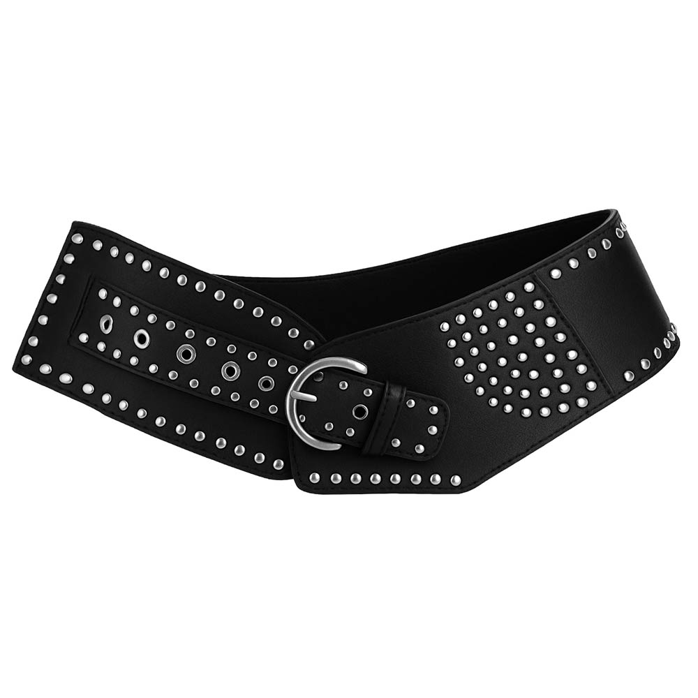 Details • Size : 3.7" H • Adjustable 40" L • Material : 100% Polyester • This wide studded fashion belt features a bold statement buckle that instantly elevates casual and dressy outfits. Designed to define the waist and add edge to denim, skirts, and layered looks, it’s ideal for boutique styling, trend-forward collections, and everyday fashion statements.