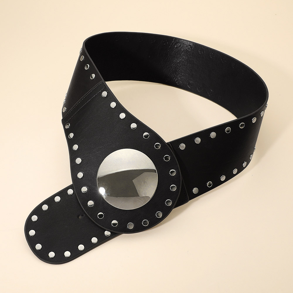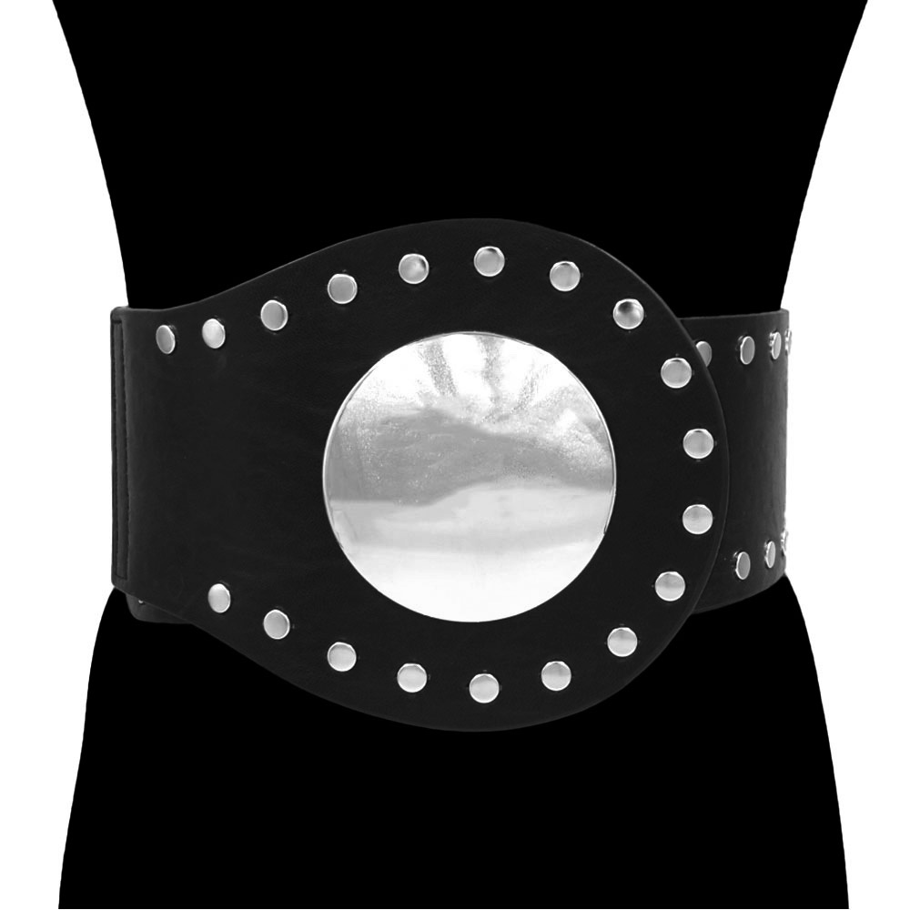 • This studded wide statement waist belt features a bold circular buckle with metallic accents that command attention. Designed to accentuate the waist with a contemporary edge, it adds a confident, high-fashion finish to dresses or tunics. Perfect for a chic and standout look.