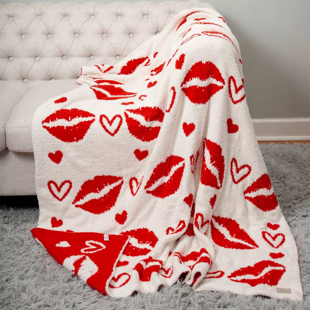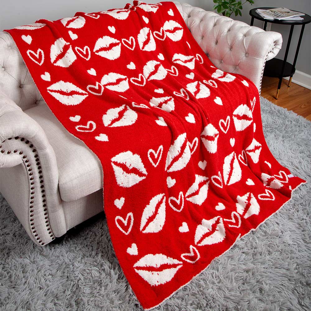 • Playful lips and heart pattern throw blanket designed for cozy lounging and stylish home dĂ©cor. Ideal for sofas, beds, or chairs, it adds a fun, romantic accent while providing everyday comfort, making it perfect for gifting, seasonal dĂ©cor, or casual relaxation.