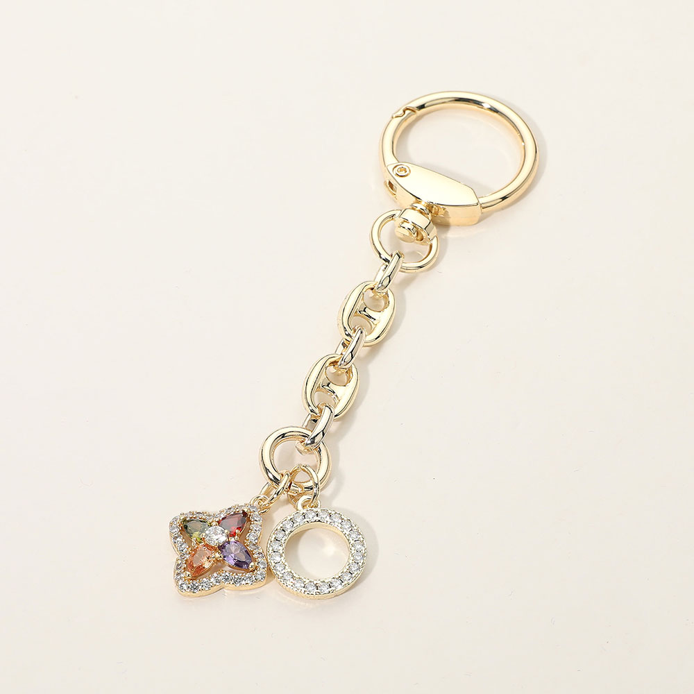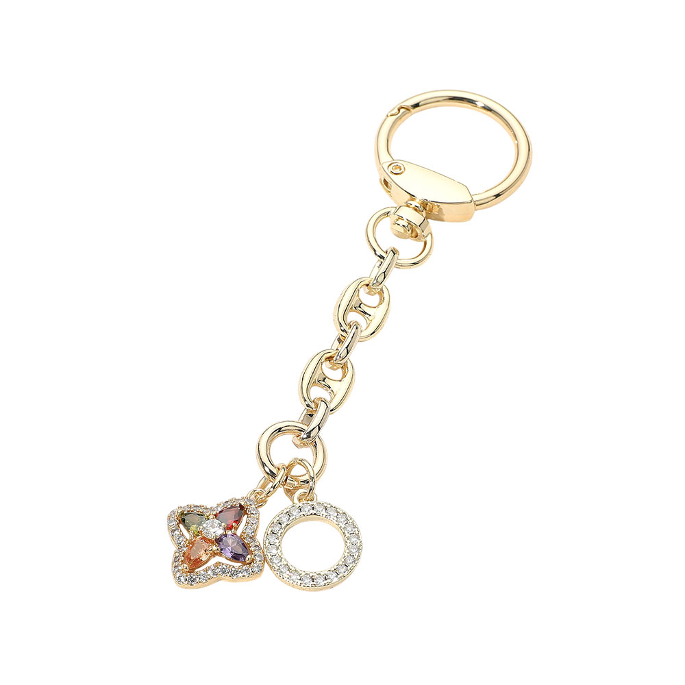 Details • Size : 4.6" L, 0.8" X 3" • This charm keychain features a clover-inspired accent paired with a crystal-trimmed circular charm for a playful yet elegant statement. Designed with linked chain details for easy attachment, it’s ideal for boutiques seeking giftable accessories that add sparkle, personality, and everyday style to keys or bags. • CZ Cubic Zirconia • Gold Dipped